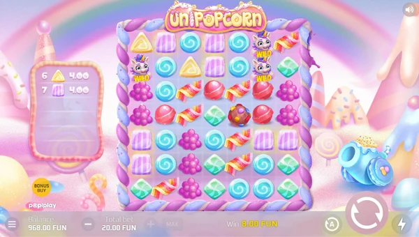 In this casino game, you won't find the typical paylines. Instead, you need to match symbols in a cluster to win (also known as cluster pays). The theme and atmosphere of the Unipopcorn are all about Candy, Candies, Magic, Sweets, Unicorn, and much more.